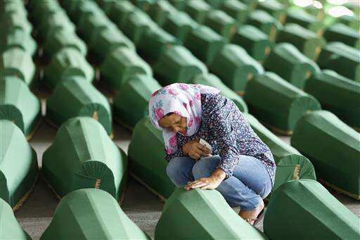 A Bosnian Muslim woman touches the coffin of a relative, among 127 coffins displayed at thememorial centre of Potocari near Srebrenica, 150 kms north east of Sarajevo, Bosnia, Saturday, July 9, 2016, prior to their burial scheduled for Monday. Thousands of Bosnians raised their hands in prayer Saturday as a truck bearing 127 coffins passed through the capital on its way to Srebrenica, where the newly identified victims of Europe's worst massacre since World War II will be buried on the 21th anniversary of the crime. (AP Photo/Amel Emric)