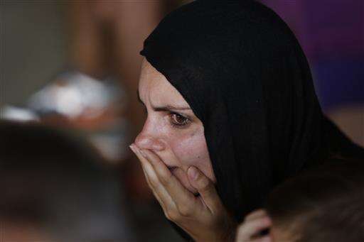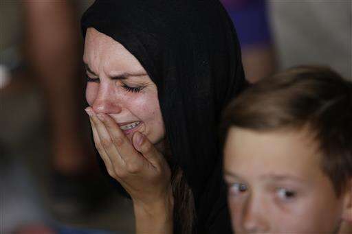 Bosnian Muslim woman Emina Dzanic, 20, weeps, near to her grandfather's coffin among 127 coffins displayed at the memorial centre of Potocari near Srebrenica, 150 kms north east of Sarajevo, Bosnia, Saturday, July 9, 2016, prior to their burial scheduled for Monday. Thousands of Bosnians raised their hands in prayer Saturday as a truck bearing 127 coffins passed through the capital on its way to Srebrenica, where the newly identified victims of Europe's worst massacre since World War II will be buried on the 21th anniversary of the crime. (AP Photo/Amel Emric)