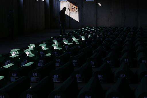 A Bosnian Muslim man walks among 127 coffins displayed at the memorial centre of Potocari near Srebrenica, 150 kms north east of Sarajevo, Bosnia, Saturday, July 9, 2016, prior to their burial scheduled for Monday. Thousands of Bosnians raised their hands in prayer Saturday as a truck bearing 127 coffins passed through the capital on its way to Srebrenica, where the newly identified victims of Europe's worst massacre since World War II will be buried on the 21th anniversary of the crime. (AP Photo/Amel Emric)