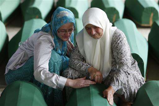 Bosnian Muslim women touch the coffin of a relatives among 127 coffins displayed at a memorial centre of Potocari near Srebrenica, 150 kms north east of Sarajevo, Bosnia, Saturday, July 9, 2016, prior to their burial scheduled for Monday. Thousands of Bosnians raised their hands in prayer Saturday as a truck bearing 127 coffins passed through the capital on its way to Srebrenica, where the newly identified victims of Europe's worst massacre since World War II will be buried on the 21th anniversary of the crime. (AP Photo/Amel Emric)