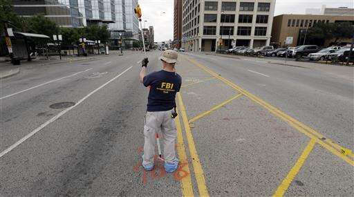 Investigators work in the area of downtown Dallas that remains an active crime scene, Saturday, July 9, 2016. Micah Johnson, an Army veteran, opened fire on police officers in the heart of Dallas Thursday, as hundreds of people were gathered to protest two recent fatal police shootings of black men, Philando Castile and Alton Sterling. (AP Photo/Eric Gay) The Associated Press