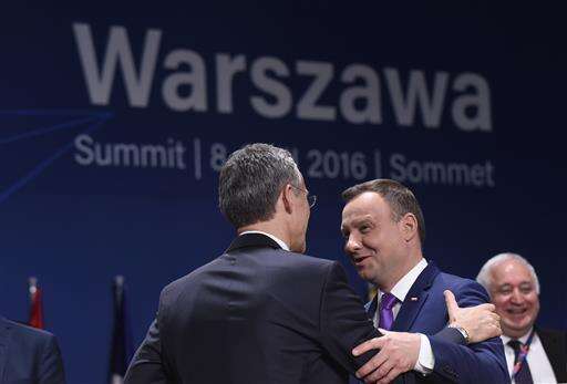 NATO Secretary General Jens Stoltenberg, left, talks with Polish President Andrzej Duda before the start of a session of the North Atlantic Council at PGE National Stadium in Warsaw, Poland, Saturday, July 9, 2016. (AP Photo/Susan Walsh) The Associated Press