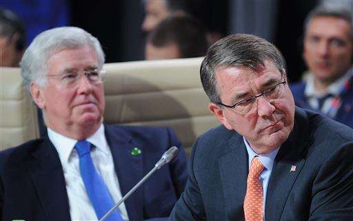 U.S. Secretary of Defense Ash Carter, right, and his British counterpart Michael Fallon attend the defense ministers session during the second day of the NATO Summit, in Warsaw, Poland, Saturday, July 9, 2016. US President Barack Obama and leaders of the 27 other NATO countries are taking decisions in Warsaw on how to deal with a resurgent Russia, violent extremist organizations like Islamic State group , attacks in cyberspace and other menaces to allies' security. (AP Photo/Alik Keplicz) The Associated Press