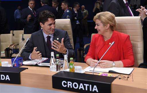 Canadian Prime Minister Justin Trudeau, left, talks with Croatian Prime Minister Kolinda Grabar-Kitarovic as they attend a session of the North Atlantic Council at PGE National Stadium in Warsaw, Poland, Saturday, July 9, 2016. (AP Photo/Susan Walsh) The Associated Press