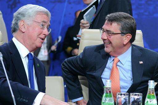 U.S. Secretary of Defense Ash Carter, right, and his British counterpart Michael Fallon talk prior to the defense ministers session during the second day of the NATO Summit, in Warsaw, Poland, Saturday, July 9, 2016. US President Barack Obama and leaders of the 27 other NATO countries are taking decisions in Warsaw on how to deal with a resurgent Russia, violent extremist organizations like Islamic State group, attacks in cyberspace and other menaces to allies' security. (AP Photo/Alik Keplicz) The Associated Press