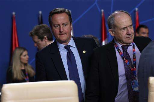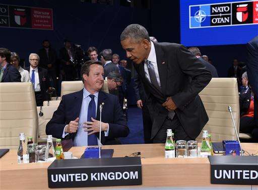 British Prime Minister David Cameron arrives for sessions of the second day of the NATO Summit, in Warsaw, Poland, Saturday, July 9, 2016. US President Barack Obama and leaders of the 27 other NATO countries are taking decisions in Warsaw on how to deal with a resurgent Russia, violent extremist organizations like the Islamic State, attacks in cyberspace and other menaces to allies' security. (AP Photo/Alik Keplicz) The Associated Press
