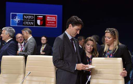 Canadian Prime Minister Justin Trudeau arrives for a session of the North Atlantic Council at PGE National Stadium in Warsaw, Poland, Saturday, July 9, 2016. (AP Photo/Susan Walsh) The Associated Press