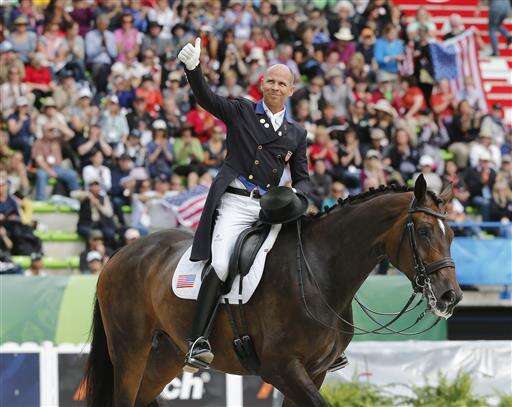 FILE - A Tuesday, Aug. 26, 2014 file photo of Steffen Peters of the United States, riding Legolas 92 acknowledging applause, after his presentation during the second day of the dressage team competition at the FEI World Equestrian Games, at Michel d'Ornano stadium in Caen, western France. Steffen Peters will make his fourth Olympic appearance in Rio. Born in Wesel, Germany, Peters emigrated to the United States in 1985, becoming a U.S. citizen in 1992. He rode in the first of three Olympic Games four years later, helping his new nation to the team bronze medal in Atlanta. (AP Photo/Michel Euler, File) The Associated Press