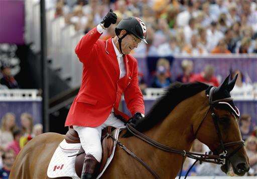 FILE - A Wednesday, Aug. 8, 2012, file photo showing Ian Millar, of Canada, giving a thumbs up after riding his horse Star Power, during the equestrian individual show jumping competition at the 2012 Summer Olympics, in London. Known as Captain Canada, Ian Millar etched his name into sporting history at London 2012, setting a new record for the most appearances in Olympic Games. The 69-year-old show jumper hopes to make it 11 at the Rio 2016. His children, Jonathon and Amy, are also hoping to qualify. (AP Photo/David Goldman, File) The Associated Press