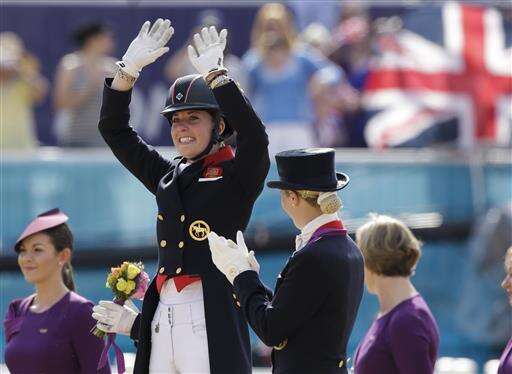 FILE - A Thursday, Aug. 9, 2012 photo from files of gold medal winner Charlotte Dujardin of Great Britain waving as she arrives for the medal ceremony of the equestrian dressage individual competition, at the 2012 Summer Olympics, in London. Charlotte Dujardin is the most successful British dressage rider in the history of the sport and dominates the discipline. The 30-year-old has won all major titles in the sport, including gold in the individual and team events at London 2012. (AP Photo/Markus Schreiber, File) The Associated Press