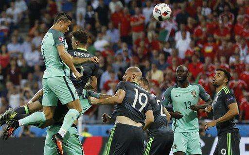 Portugal's Cristiano Ronaldo scores on a header during the Euro 2016 semifinal soccer match between Portugal and Wales, at the Grand Stade in Decines-Charpieu, near Lyon, France, Wednesday, July 6, 2016. (AP Photo/Frank Augstein) The Associated Press