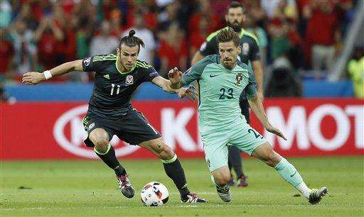 Wales' Gareth Bale, left, and Portugal's Adrien Silva fight for the ball during the Euro 2016 semifinal soccer match between Portugal and Wales, at the Grand Stade in Decines-Charpieu, near Lyon, France, Wednesday, July 6, 2016. (AP Photo/Frank Augstein) The Associated Press