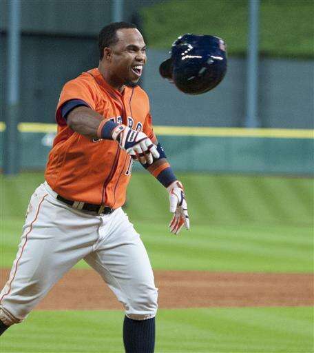 The Houston Astros Luis Valbuena celebrates his walk-off home run against the Oakland Athletics in the ninth inning of a baseball game Friday, July 8, 2016, in Houston. (AP Photo/George Bridges) The Associated Press
