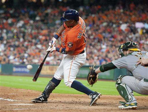 The Houston Astros Luis Valbuena, left, hits an RBI single against the Oakland Athletics in the fifth inning of a baseball game Friday, July 8, 2016, in Houston. (AP Photo/George Bridges) The Associated Press