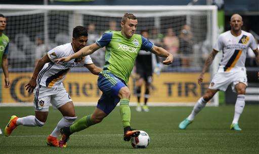 Seattle Sounders forward Jordan Morris, center, drives past Los Angeles Galaxy's A. J. DeLaGarza, left, in the first half of an MLS soccer match, Saturday, July 9, 2016 in Seattle. (AP Photo/Ted S. Warren) The Associated Press