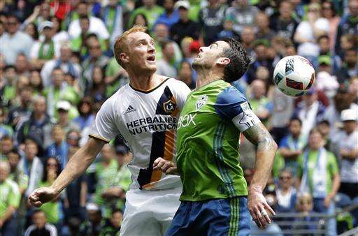 Los Angeles Galaxy defender Jeff Larentowicz, left, goes for a header against Seattle Sounders defender Zach Scott, right, in the first half of an MLS soccer match, Saturday, July 9, 2016 in Seattle. (AP Photo/Ted S. Warren) The Associated Press