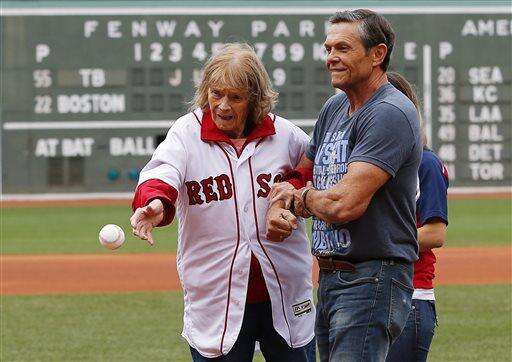 About to turn 100-years-old, Babe Ruth's daughter Julia Ruth Stevens throws out the ceremonial first pitch with help from her son Tom before a baseball game between the Boston Red Sox and the Tampa Bay Rays at Fenway Park in Boston, Saturday, July 9, 2016. (AP Photo/Winslow Townson) The Associated Press