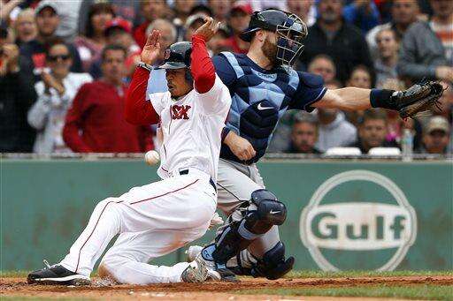 Boston Red Sox's Mookie Betts slides safely home as the ball gets past Tampa Bay Rays catcher Curt Casali during the fifth inning of a baseball game at Fenway Park in Boston, Saturday, July 9, 2016. (AP Photo/Winslow Townson) The Associated Press