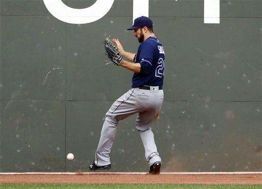 Tampa Bay Rays center fielder Steven Souza Jr. drops the ball at the wall for an error on a hit by Boston Red Sox's Mookie Betts during the fifth inning of a baseball game at Fenway Park in Boston, Saturday, July 9, 2016. (AP Photo/Winslow Townson) The Associated Press