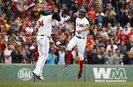 Boston Red Sox's Xander Bogaerts, right, celebrates his two-run home run with teammate David Ortiz (34) during the fourth inning of a baseball game against the Tampa Bay Rays at Fenway Park in Boston Saturday, July 9, 2016. (AP Photo/Winslow Townson) The Associated Press
