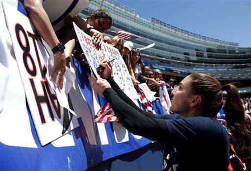 United States goalie Hope Solo autographs for fans after United States defeated South Africa 1-0 in an the international friendly women's soccer match in Chicago, on Saturday, July 9, 2016. (AP Photo/Nam Y. Huh) The Associated Press