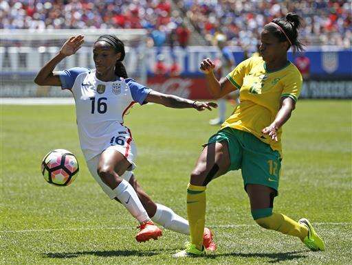 United States forward Crystal Dunn, left, controls the ball against South Africa midfielder Jermaine Seoposenwe during the first half of the international friendly women's soccer match in Chicago, on Saturday, July 9, 2016. (AP Photo/Nam Y. Huh) The Associated Press
