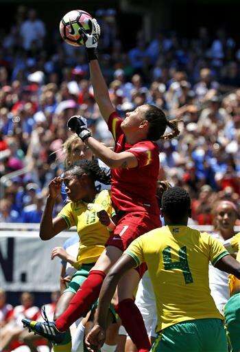 South Africa goalie Roxanne Barker reaches for a high ball against United States during the first half of the international friendly women's soccer match in Chicago, on Saturday, July 9, 2016. (AP Photo/Nam Y. Huh) The Associated Press