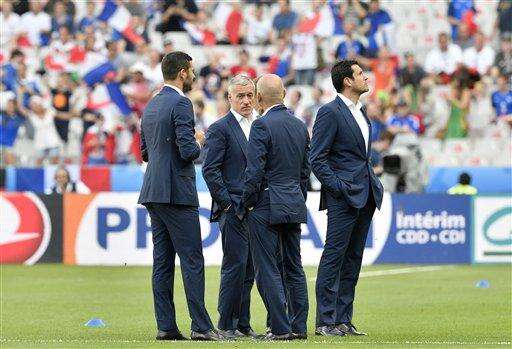 France coach Didier Deschamps stayed on the field only briefly with members of his staff 90 minutes before the kickoff