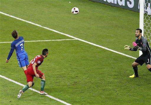 Tournament top scorer Antoine Griezmann missed probably the clearest chance of the final in the 66th minute when he shook off defender Raphael Guerreiro in the penalty area and leapt to meet a cross from the left by Kingsley Coman, but could not keep his header down and saw it fly over the bar.