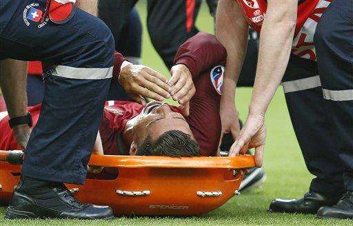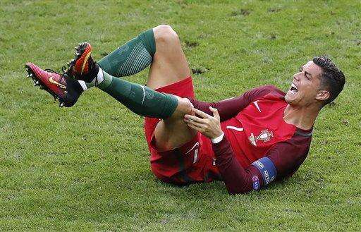 Ronaldo injured his left knee after France midfielder Dimitri Payet clattered into him near the halfway line in the seventh minute. After treatment, the Real Madrid star tried to play on, but even with his knee bandaged he eventually sat down and called to be substituted.