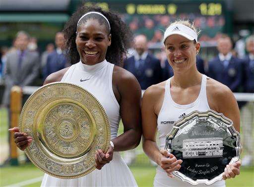 Serena Williams of the U.S, left, holds up her trophy next to Angelique Kerber of Germany after beating her in the women's singles final on day thirteen of the Wimbledon Tennis Championships in London, Saturday, July 9, 2016. (AP Photo/Tim Ireland)