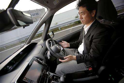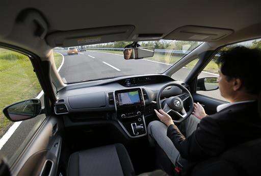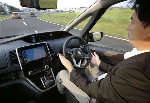 In this July 12, 2016 photo, Nissan Motor Co. Deputy General Manager Atsushi Iwaki gets his hands off of the steering wheel of a self-driving new Serena minivan during a test drive at Nissan test course in Yokosuka, near Tokyo. The Serena minivan equipped with ProPilot technology relies on a single camera in the back of the driver's rearview mirror. The car can then follow the vehicle ahead, maintaining a safe distance that the driver sets. (AP Photo/Shizuo Kambayashi)