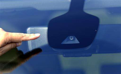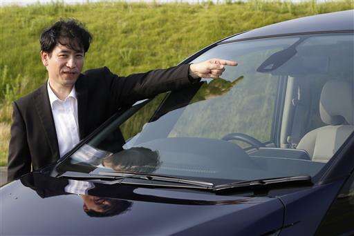 In this July 12, 2016 photo, Nissan Motor Co. Deputy General Manager Atsushi Iwaki points a ProPilot system camera on new Serena minivan during an interview at Nissan test course in Yokosuka, near Tokyo. The Serena minivan equipped with ProPilot technology relies on a single camera in the back of the driver's rearview mirror. The car can then follow the vehicle ahead, maintaining a safe distance that the driver sets. (AP Photo/Shizuo Kambayashi)