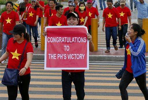 Filipinos applaud moments after the Hague-based U.N. international arbitration tribunal's ruling favoring the Philippines in its case against China on the dispute in South China Sea Tuesday, July 12, 2016 in Manila, Philippines. The international tribunal has found that there is no legal basis for China's "nine-dash line" claiming rights to much of the South China Sea. The tribunal issued its ruling Tuesday in The Hague in response to an arbitration case brought by the Philippines against China. (AP Photo/Bullit Marquez) The Associated Press
