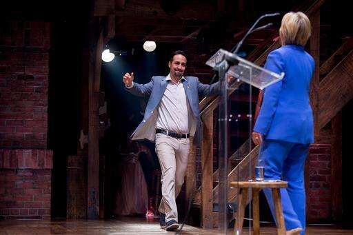 The Democratic presidential candidate was speaking at the end of a campaign-sponsored performance of the Broadway smash at New York's Richard Rodgers Theatre.