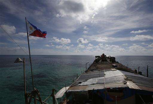 In this photo taken March 29, 2014, a Philippine flag flutters from the deck of the Philippine Navy ship LT 57 Sierra Madre off Second Thomas Shoal in the South China Sea. China has intensified the drumbeat of its opposition to a milestone ruling expected Tuesday, July 12, 2016, by an international tribunal that could threaten its expansive claims in the South China Sea.(AP Photo/Bullit Marquez)