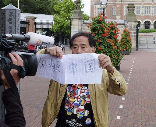 A man holds up a handwritten sign in Chinese which says "South Sea belongs to China", in reference to the South China Sea, outside the Peace Palace in The Hague, Netherlands, on Tuesday, July 12, 2016, ahead of a ruling by the Permanent Court of Arbitration (PCA) on the dispute between China and the Philippines over the South China Sea. China has intensified the drumbeat of its opposition to an international tribunal's ruling expected Tuesday that could threaten its expansive claims in the South China Sea. (AP Photo/Mike Corder)