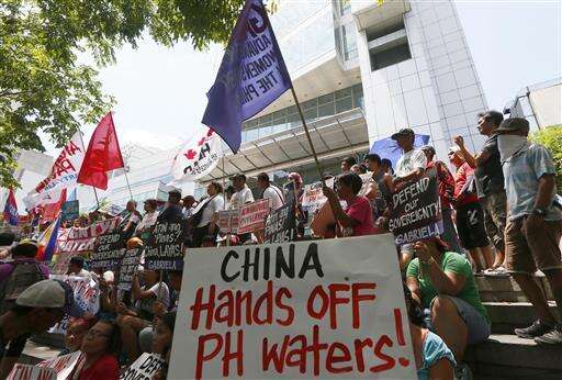 Protesters display their message during a rally outside of the Chinese Consulate hours before the Hague-based UN international arbitration tribunal is to announce its ruling on South China Sea Tuesday, July 12, 2016, in Makati city east of Manila, Philippines. The protesters are urging China to respect the Philippines' rights over its exclusive economic zone and extended continental shelf as mandated by the UN Convention of the Law of the Sea or UNCLOS. (AP Photo/Bullit Marquez)