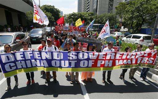 Protesters shout slogans as they march outside of the Chinese Consulate hours before the Hague-based UN international arbitration tribunal is to announce its ruling on South China Sea Tuesday, July 12, 2016, in Makati city east of Manila, Philippines. The protesters are urging China to respect the Philippines' rights over its exclusive economic zone and extended continental shelf as mandated by the UN Convention of the Law of the Sea or UNCLOS. (AP Photo/Bullit Marquez)