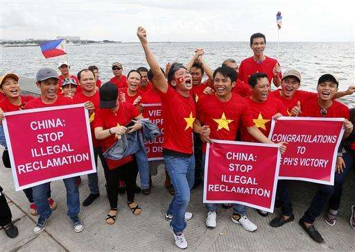 Vietnamese expatriates cheer while displaying placards during a rally by the Manila's baywalk before the Hague-based U.N. international arbitration tribunal is to announce its ruling on South China Sea Tuesday, July 12, 2016, Philippines. The Vietnamese are supporting the Philippines' case it filed before the international tribunal on China's nine-dash line claim in the South China Sea. (AP Photo/Bullit Marquez)