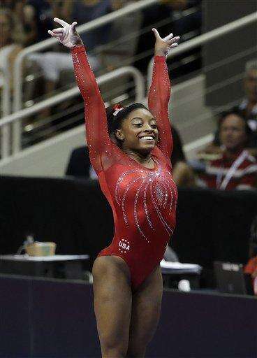 Simone Biles gestures after competing on the vault during the women's U.S. Olympic gymnastics trials in San Jose, Calif., Sunday, July 10, 2016. (AP Photo/Gregory Bull) The Associated Press