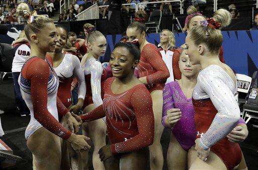 Simone Biles, center, smiles as she gathers with other competitors after the women's U.S. Olympic gymnastics trials in San Jose, Calif., Sunday, July 10, 2016. (AP Photo/Gregory Bull) The Associated Press