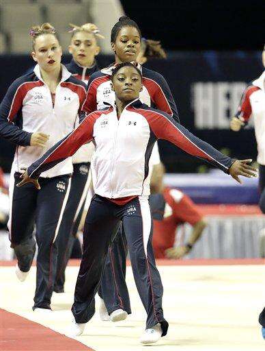 Simone Biles, foreground, runs in front of Gabrielle Douglas and other competitors before the women's U.S. Olympic gymnastics trials in San Jose, Calif., Sunday, July 10, 2016. (AP Photo/Gregory Bull) The Associated Press