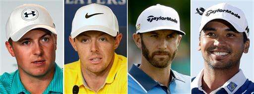 FILE - From left are 2016 file photos showing Jordan Spieth, Rory McIlroy, Dustin Johnson and Jason Day. Jordan Spieth is out of the Olympics. International Golf Federation president Peter Dawson announced the decision at the British Open. Spieth had been strongly debating whether to go over the last three days before reaching his decision on Monday, July 11, 2016. He will be replaced by Matt Kuchar. That means golf's return to the Olympics after 112-year absence will not include the top four players in the world - Jason Day, Dustin Johnson, Spieth, and Rory McIlroy. (AP Photo/File The Associated Press