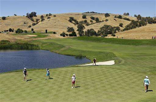 Karrie Webb, center, of Australia, misses a birdie putt on the fifth green during the second round of the U.S. Women's Open golf tournament at CordeValle, Friday, July 8, 2016, in San Martin, Calif. Christina Kim, right, and Ilhee Lee, second from left, of South Korea. (AP Photo/Eric Risberg) The Associated Press