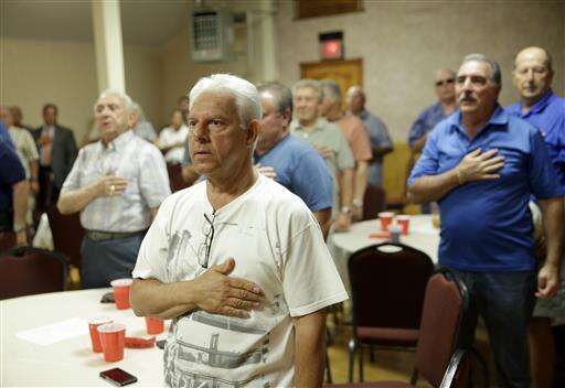 Members of the NYC Verrazano 10-13 Association, made up of retired police officers, say the Pledge of Allegiance during a meeting in the Staten Island borough of New York, Wednesday, June 15, 2016. One of the members can trace policing lineage from his grandfather's days as a bobby in northern England to his own son's promotion to detective in Brooklyn. Another recalls days on patrol when cops carried no radios. (AP Photo/Seth Wenig)
