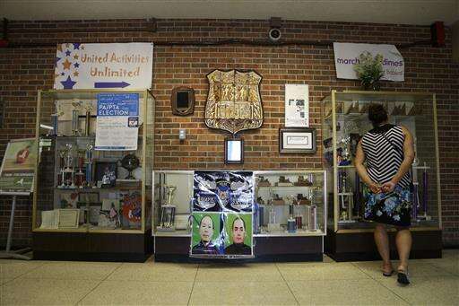 This Wednesday, May 25, 2016 photo shows a memorial to New York City police officers Wenjian Liu and Rafael Ramos in the Police Officer Rocco Laurie Intermediate School 72 in Staten Island, New York. On Dec 20, 2014, they were ambushed and shot to death in their marked police vehicle without warning. "A lot of kids in this school have parents who are police officers _ a lot," says Peter Macellari, principal of the school, where about a quarter of the students are Hispanic and 5 percent are black. He notes that Ramos was once the schoolâs security officer. (AP Photo/Seth Wenig)