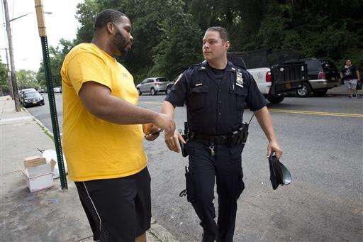 Police officer Jessi D'Ambrosio, left, of the 120th precinct in the Staten Island borough of New York, speaks to a resident while on patrol at the Richmond Terrace Houses, Thursday, July 7, 2016. D'Ambrosio, 32, and his partner, Mary Gillespie, 28, are the new "neighborhood coordinating officers" for the six-building project where Eric Garner once lived. Jersey Street, with a reputation for crime, runs the length of a complex, most of whose residents are black. âWe want them to feel comfortable with us and thatâs what weâre building on,â Gillespie says. (AP Photo/Mary Altaffer)