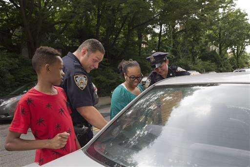 Police officers Mary Gillespie, right, and Jessi D'Ambrosio of the 120th precinct, help Monique Williams, center, after she accidentally locked her two children inside the car with the air conditioner running, at the Richmond Terrace Houses in the Staten Island borough of New York on Thursday, July 7, 2016. (AP Photo/Mary Altaffer)