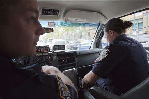 Police officers Mary Gillespie, right, and Jessi D'Ambrosio of the 120th precinct sit in their patrol van at the Richmond Terrace houses in the Staten Island borough of New York, Thursday, July 7, 2016. In 2015, the city began assigning pairs of officers to specific neighborhoods, rather than having them rush from call to call across precincts. They are mandated to spend a third of their shift "off-radio," talking with residents to forge relationships. The new approach was rolled out to the North Shore in December. (AP Photo/Mary Altaffer)